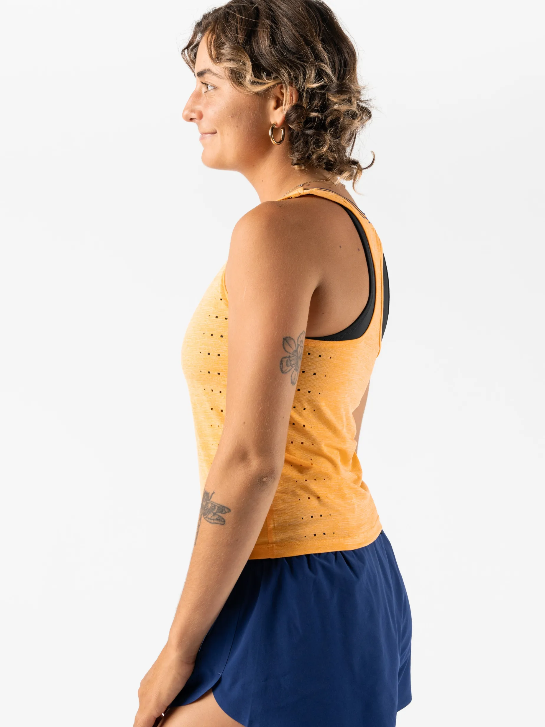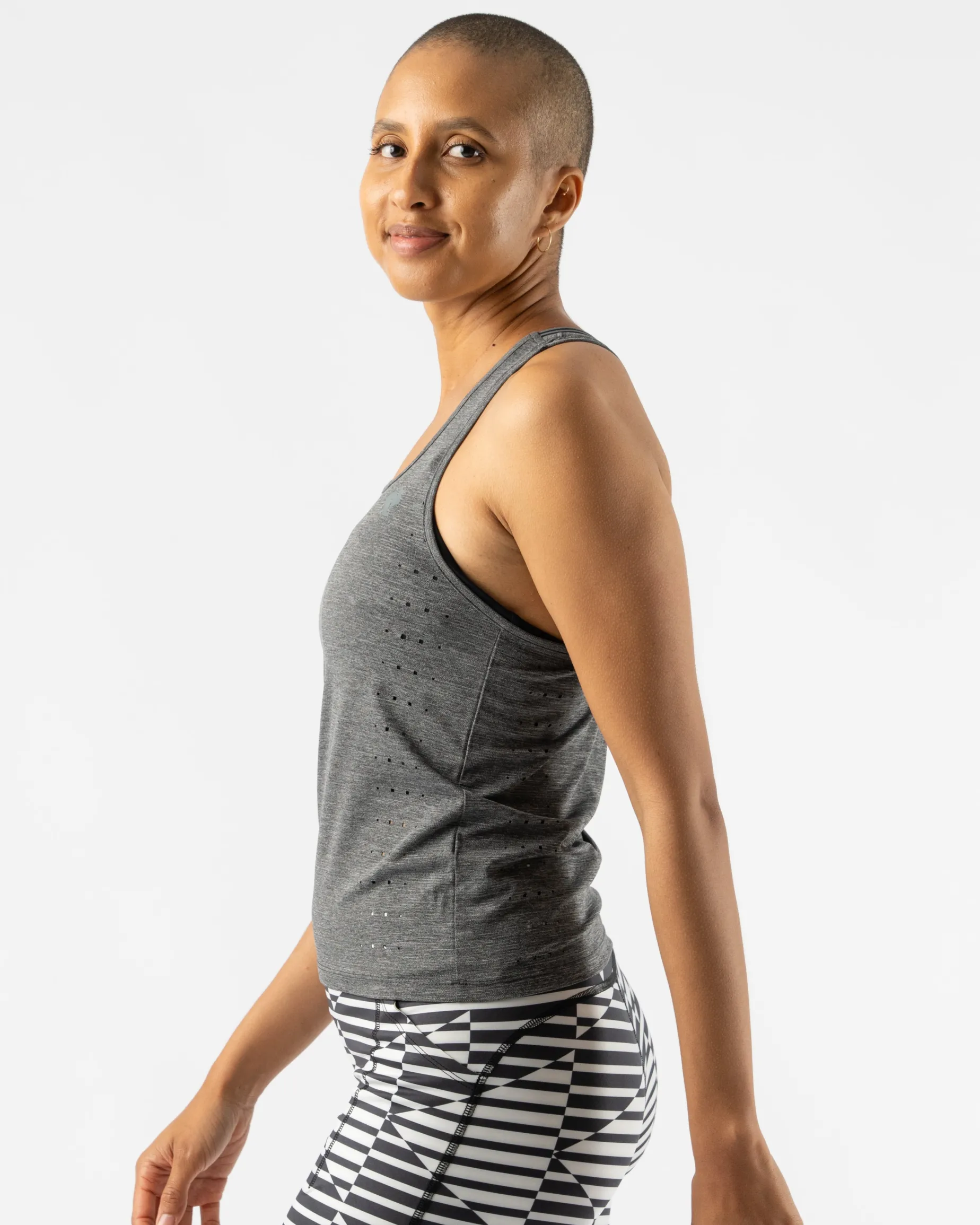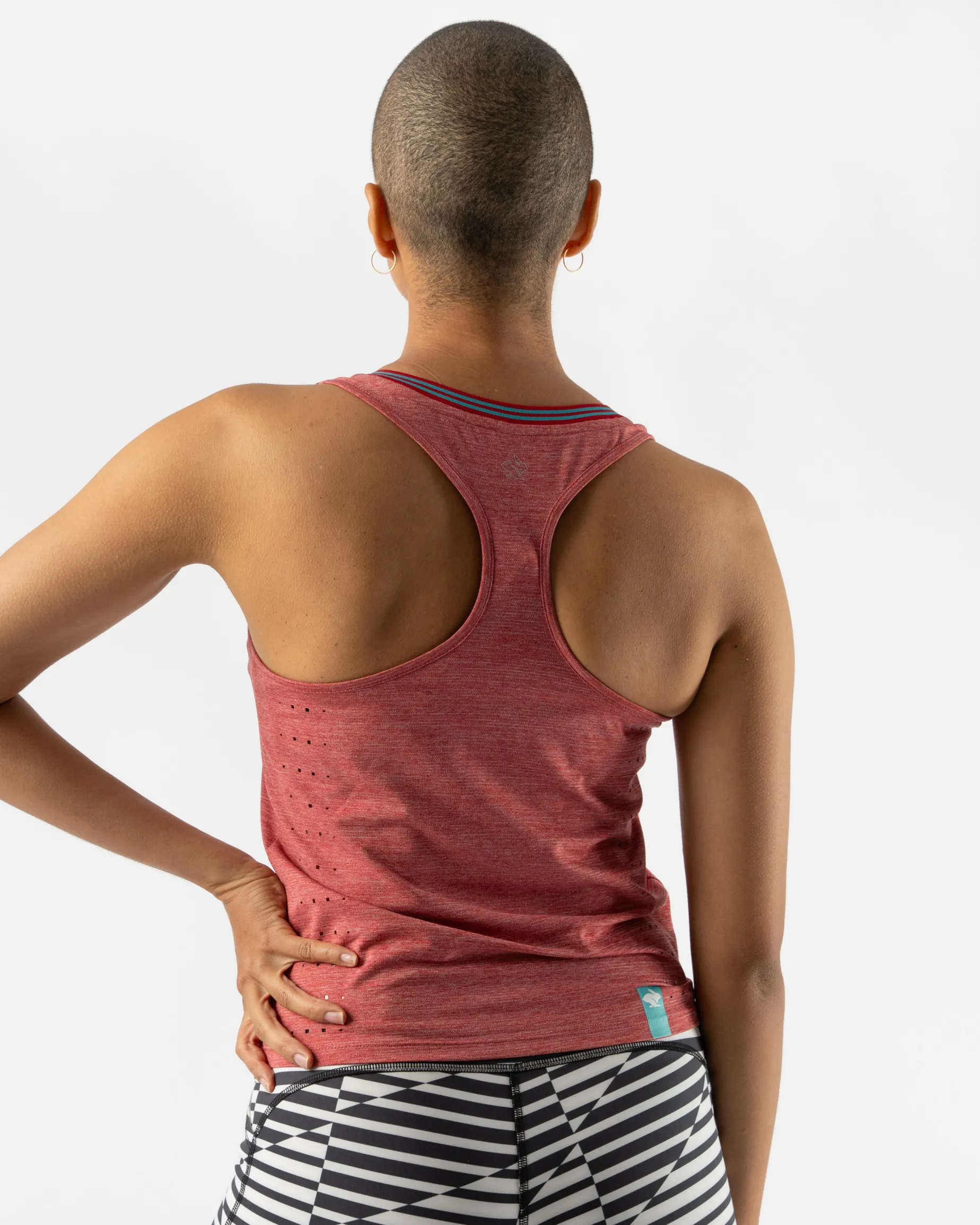 The flow is all you’ll know in our new tailored race tank. Laser-cut square perfs and anti-cling microtexture, plus other elevated details, keep you cool and comfortable from start to finish.