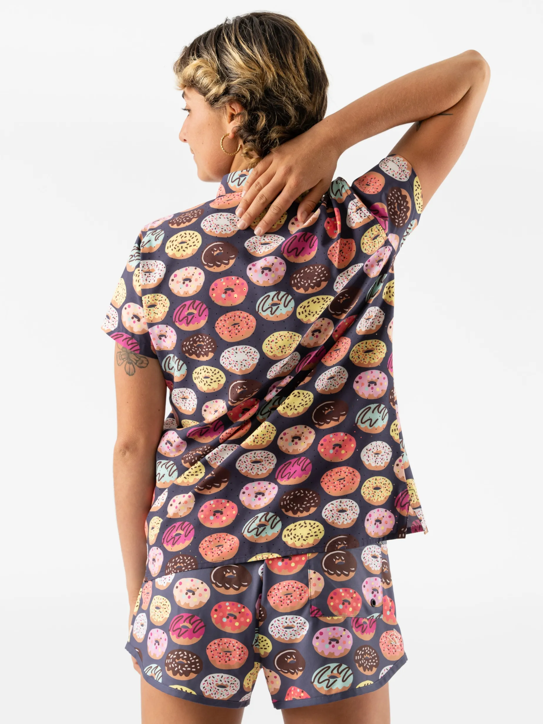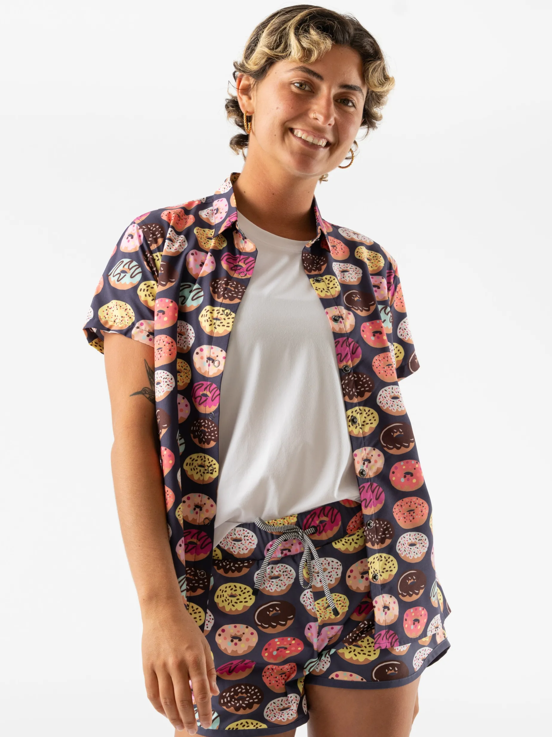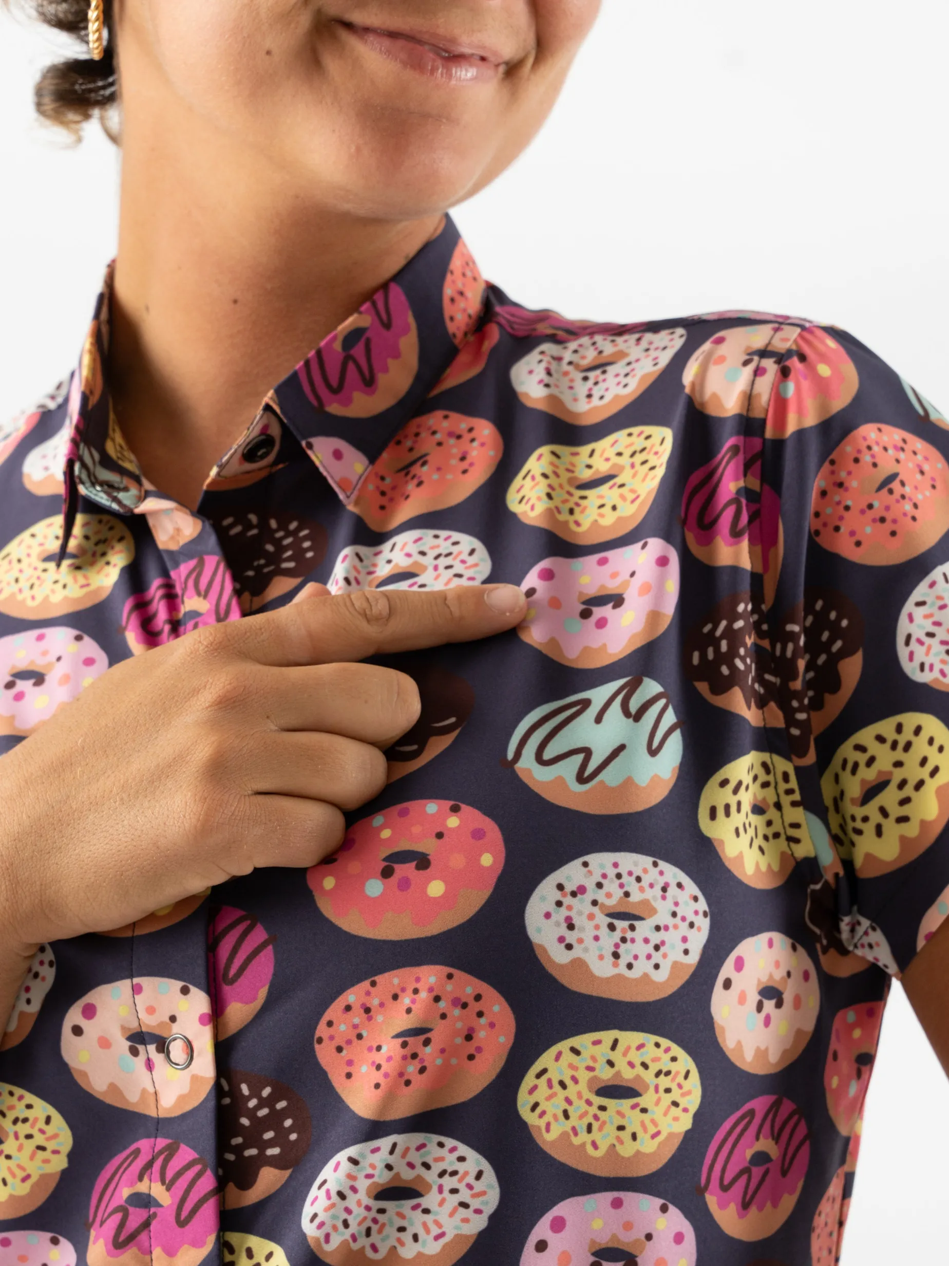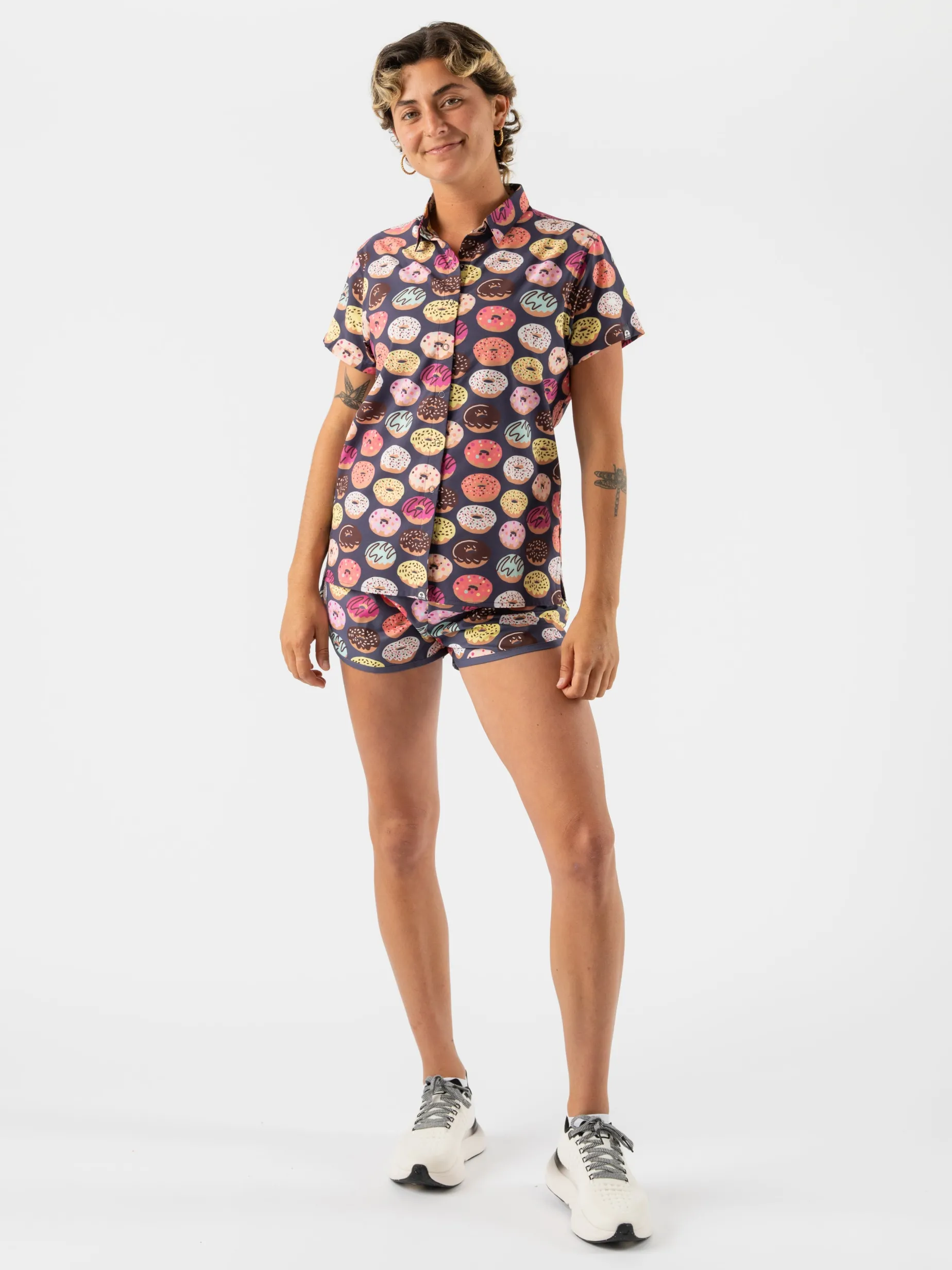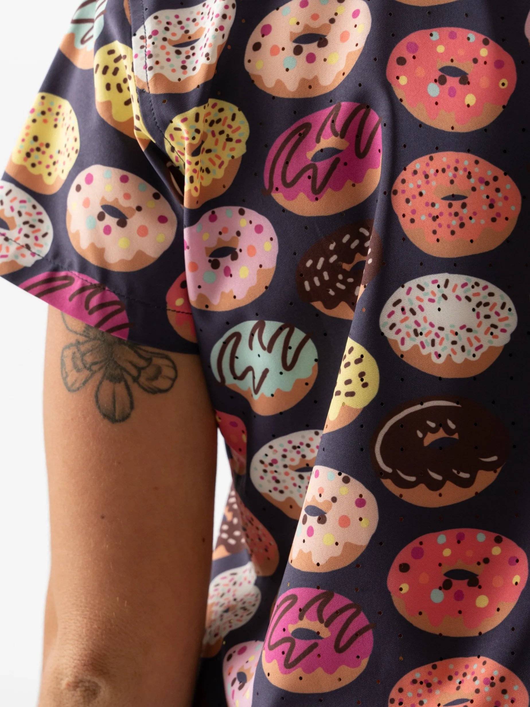 Get ready for Donut Day! Soak up rays or race the waves in our sweat-wicking performance print. The breeze rolls through the perfed back panel. Snap up, layer, or throw on a pack with ease.